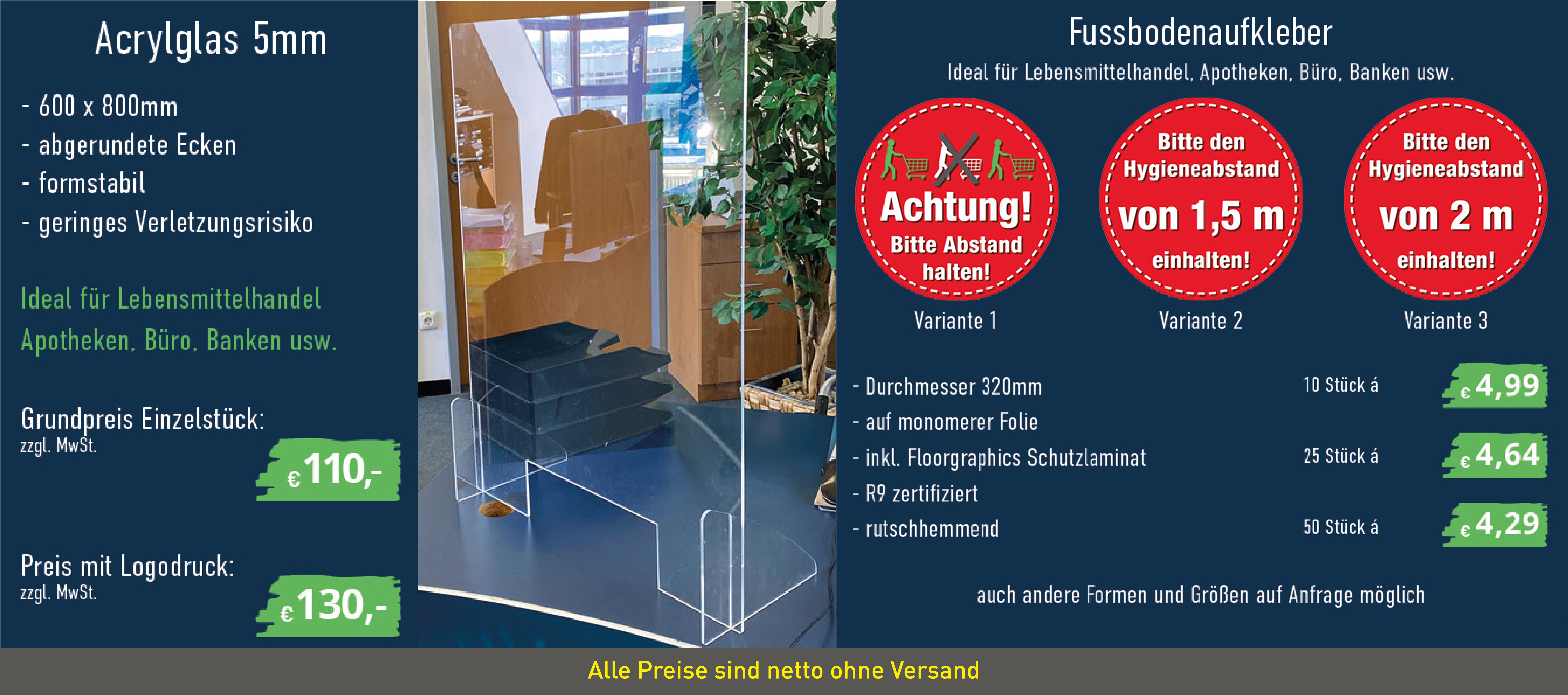Zudem bieten wir Ihnen noch weitere Möglichkeiten an, damit die allgemeinen Schutzmaßnahmen besser berücksichtigt werden können. Hierfür eignen sich besonders unsere Fussbodenaufkleber.
